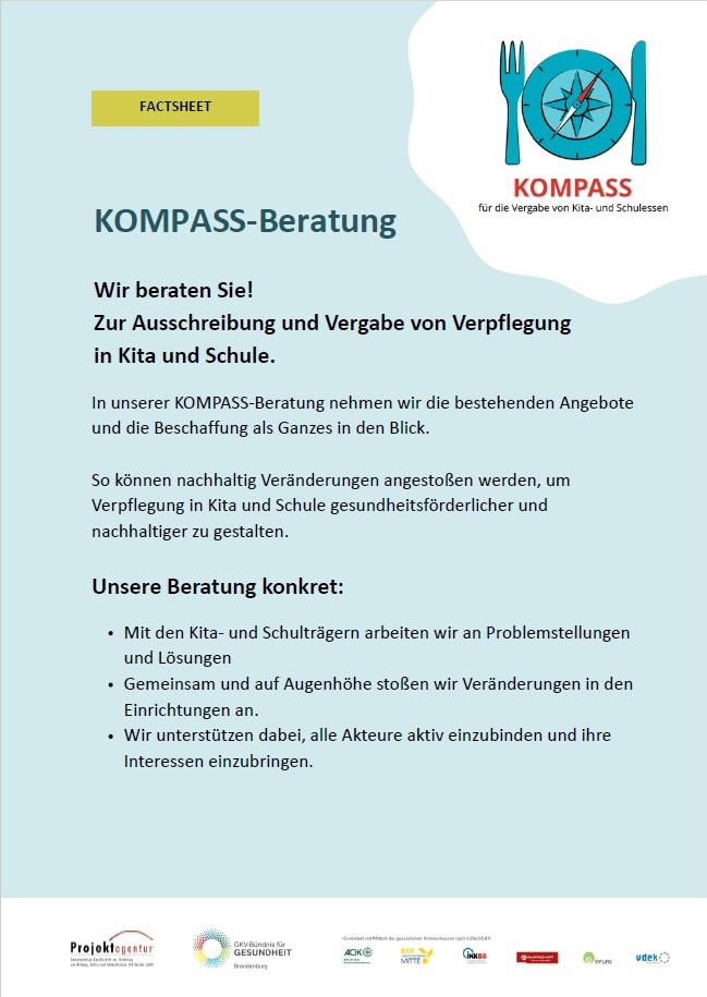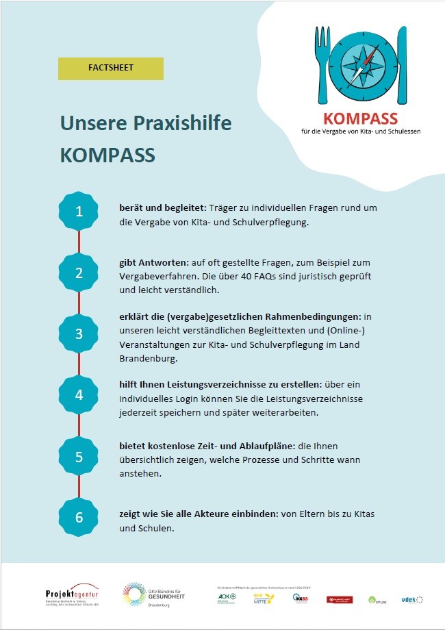 Mit diesem KOMPASS unterstützt die Vernetzungsstelle Brandenburg Bildungseinrichtungen und deren Träger im Land Brandenburg dabei, Vergabeverfahren für Verpflegungsleistungen vorzubereiten und durchzuführen.